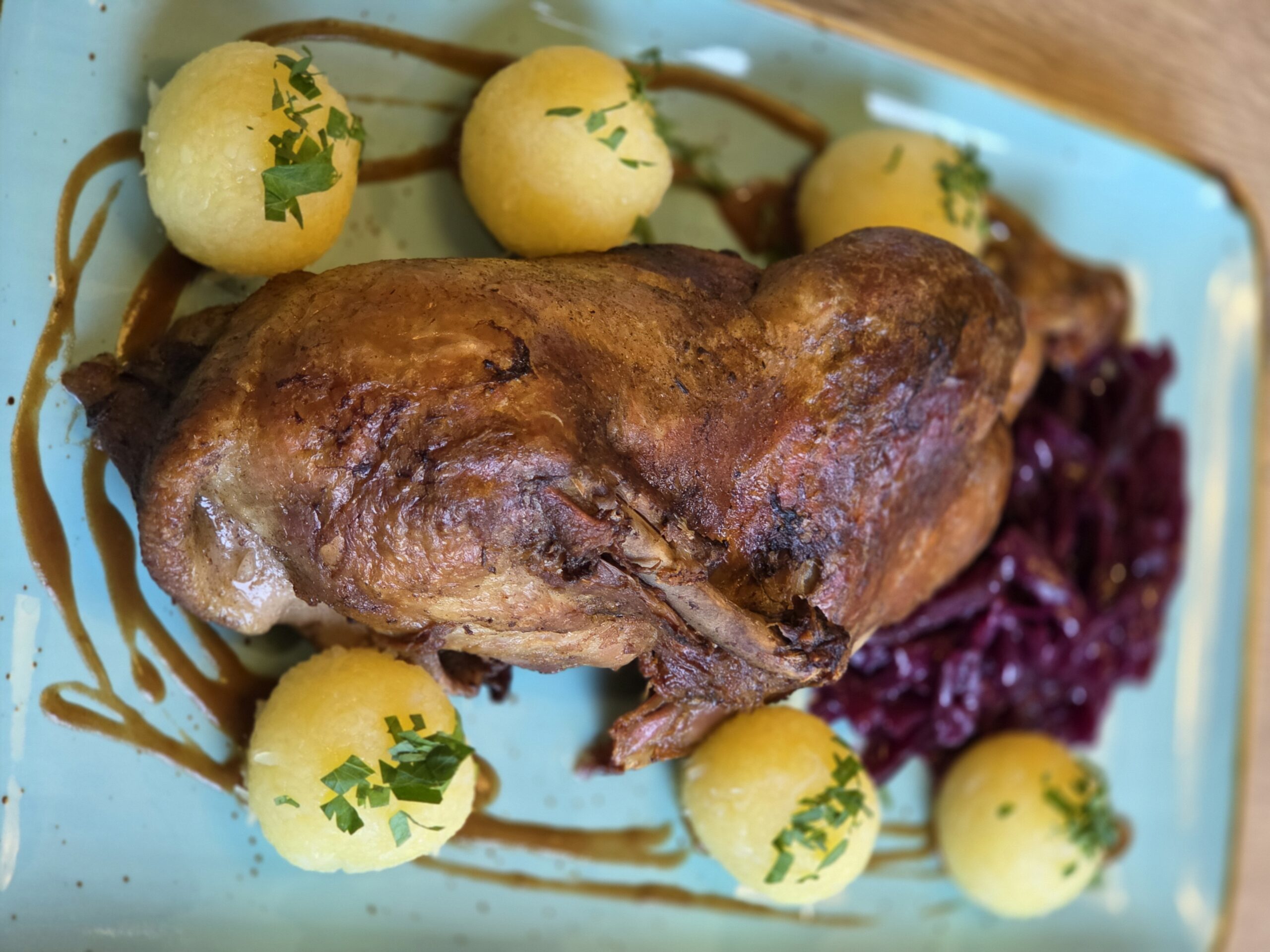 Freuen Sie sich auf wunderbar zarte Ente, sous-vide gegart,wahlweise als Viertel oder Halbe Ente,serviert mit klassischem Rotkohl und hausgemachten Klößen.